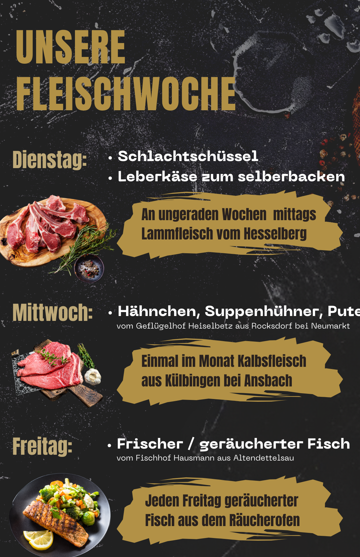 Jeden Mittwoch erhalten wir frisch geschlachtetes Geflügel vom Geflügelhof Heißelbetz aus Rocksdorf bei Neumarkt.